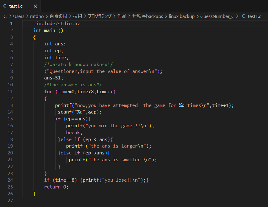 題名は「数あてゲーム」で、私が設定した1~100の数字を回答者が10回の試行の中で答えを見つけるゲームです。このプログラムでは、回答者の数字と答えと比べた数字の大小を判定して、結果を表示し答えに近づいていきます。